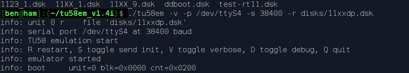 Since I don’t have any actual peripherals, I can use a TU58 tape drive emulator running via serial. I have four serial ports on the PDP-11, with one being used for the console. I can use another to connect to the TU58 emulator on a Linux machine.